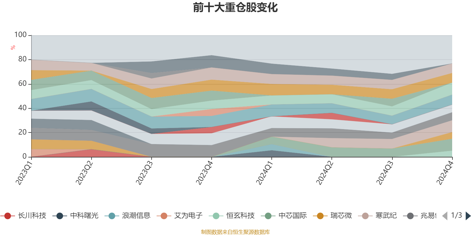 该基金持股集中度较高,近2年前十大重仓股集中度长期超过60%。截至2024年四季度末,基金十大重仓股分别是海光信息、中芯国际、寒武纪、北方华创、中微公司、圣邦股份、兆易创新、韦尔股份、瑞芯微、恒玄科技。